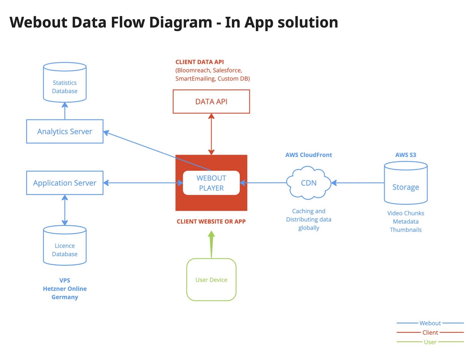 - Video files and metadata (such as personalization positions, interactive elements, etc.) are stored in AWS S3 Storage. These video files are also served through the AWS Cloudflare CDN service.